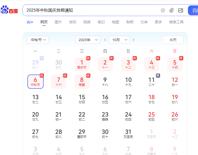 放假時(shí)間:10 月 1 日(周三)至 10 月 8 日(周三),共 8 天。